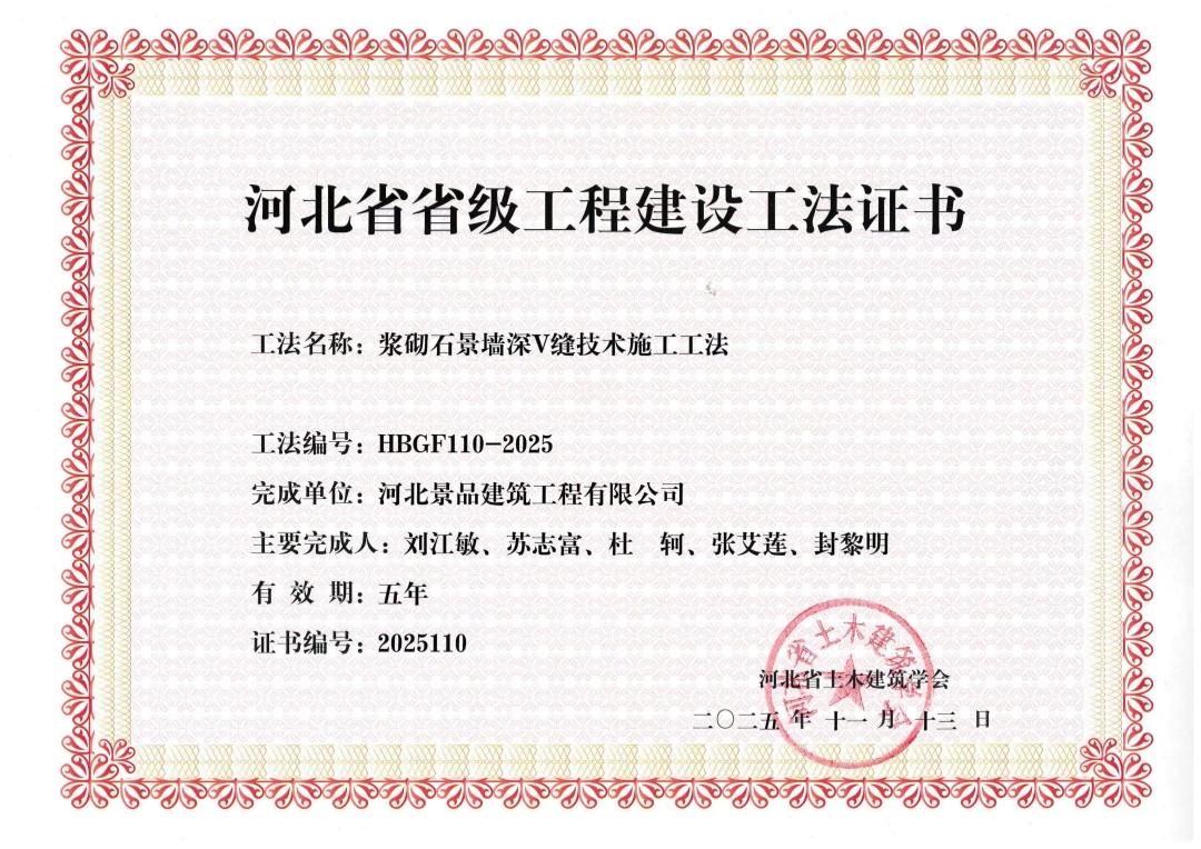 近日,经河北省土木建筑学会评审,由我集团自主研发并申报的《浆砌石景墙深V缝技术施工工法》成功获评2025年度河北省省级工程建设工法。此项荣誉标志着集团在建筑科技领域的创新实力与技术积淀获得权威认可。