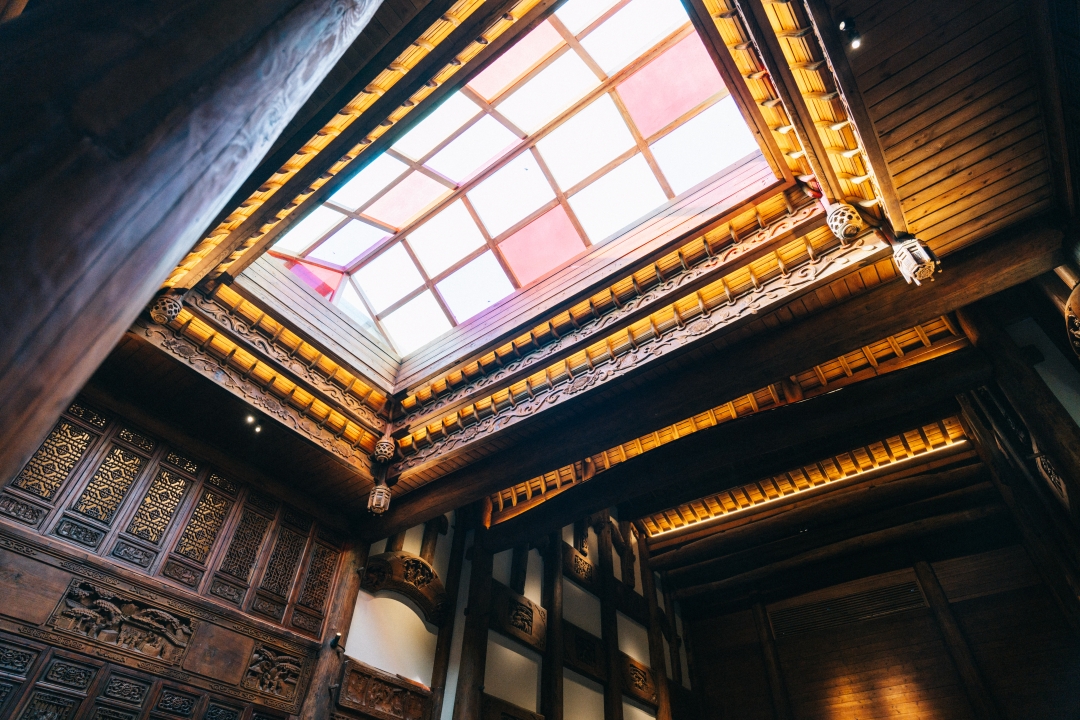 两个空间中间均设有近8米挑高的“天井”,这既是对南方建筑布局的保留与延伸,也有着“四水归堂”的吉祥寓意,自然光透过玻璃天井,赋予了建筑一种独特的视觉效果,使得室内空间与自然环境相互渗透,营造出一种宁静和谐的氛围。
