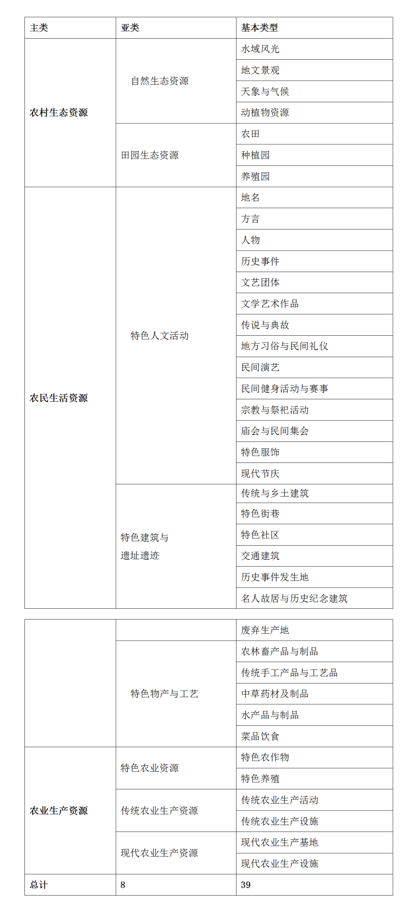 依据乡、土、农三个方面的主要特征,对乡村旅游资源进行分类。“乡”对应农村生态资源,“土”对应农民生活资源,“农”对应农业生产资源。总体分为“主类”、“亚类”和“基本类型”3个层次,共计8个亚类,39个基本类型。